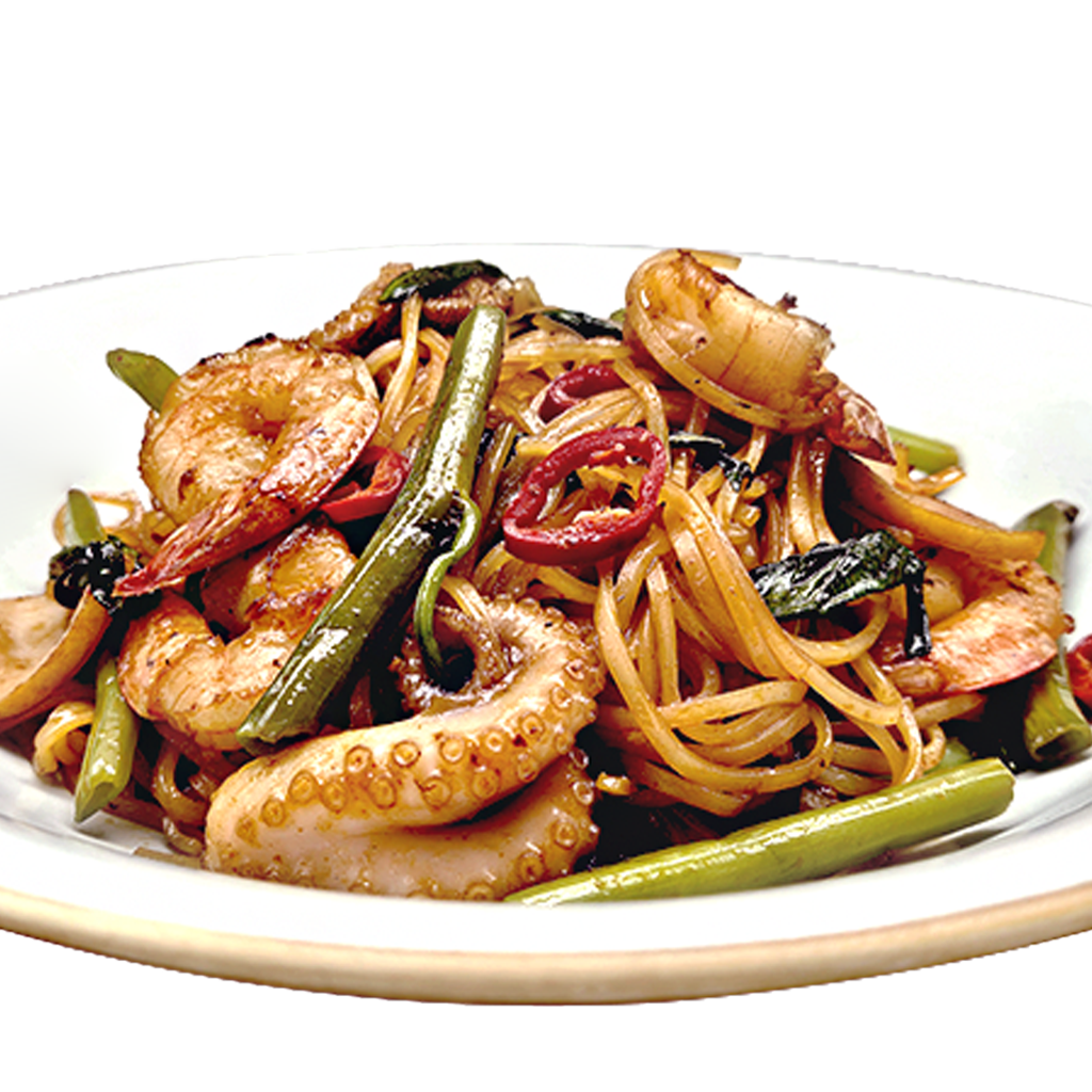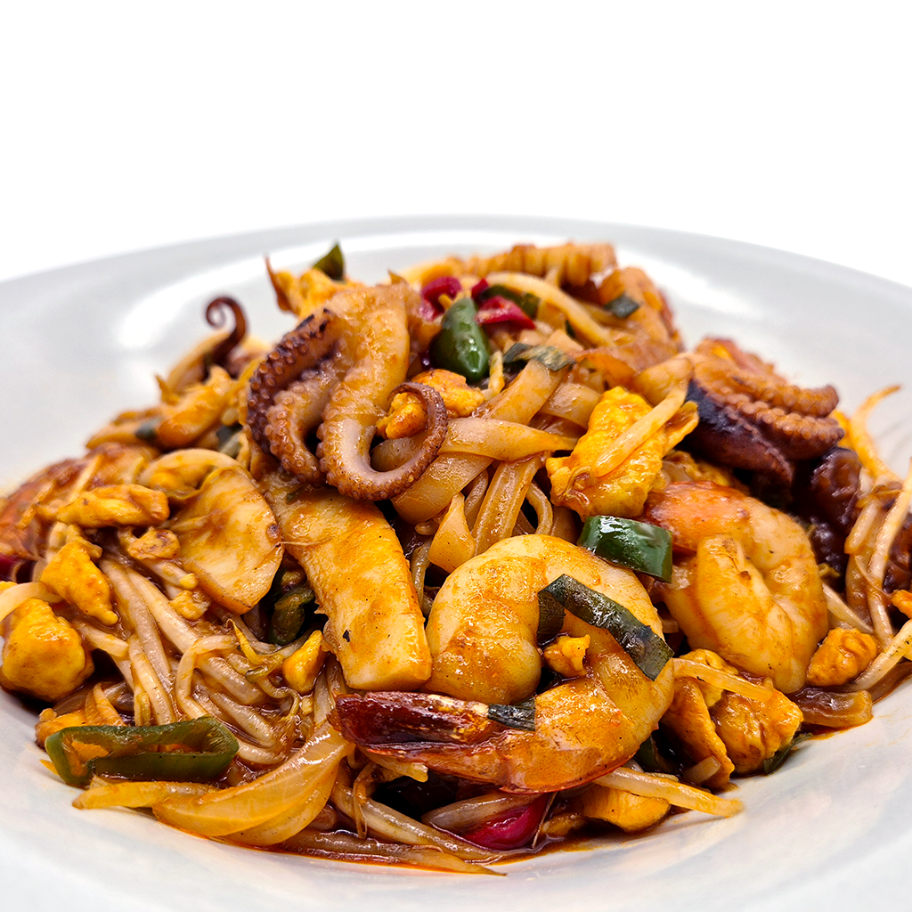 쌀국수와 해산물, 신선한 야채, 계란을 칠리 소스로 볶아낸 매콤한 볶음 쌀국수