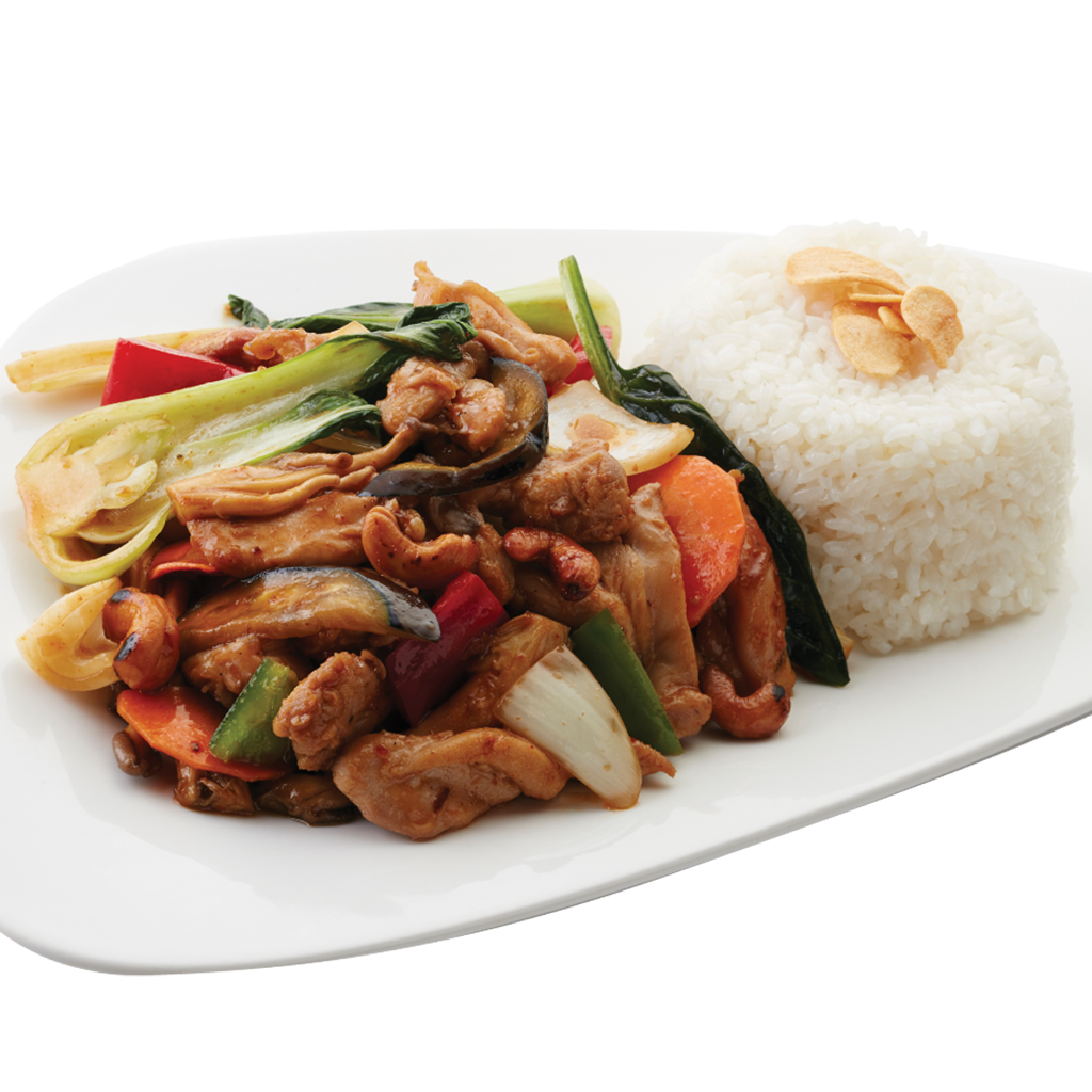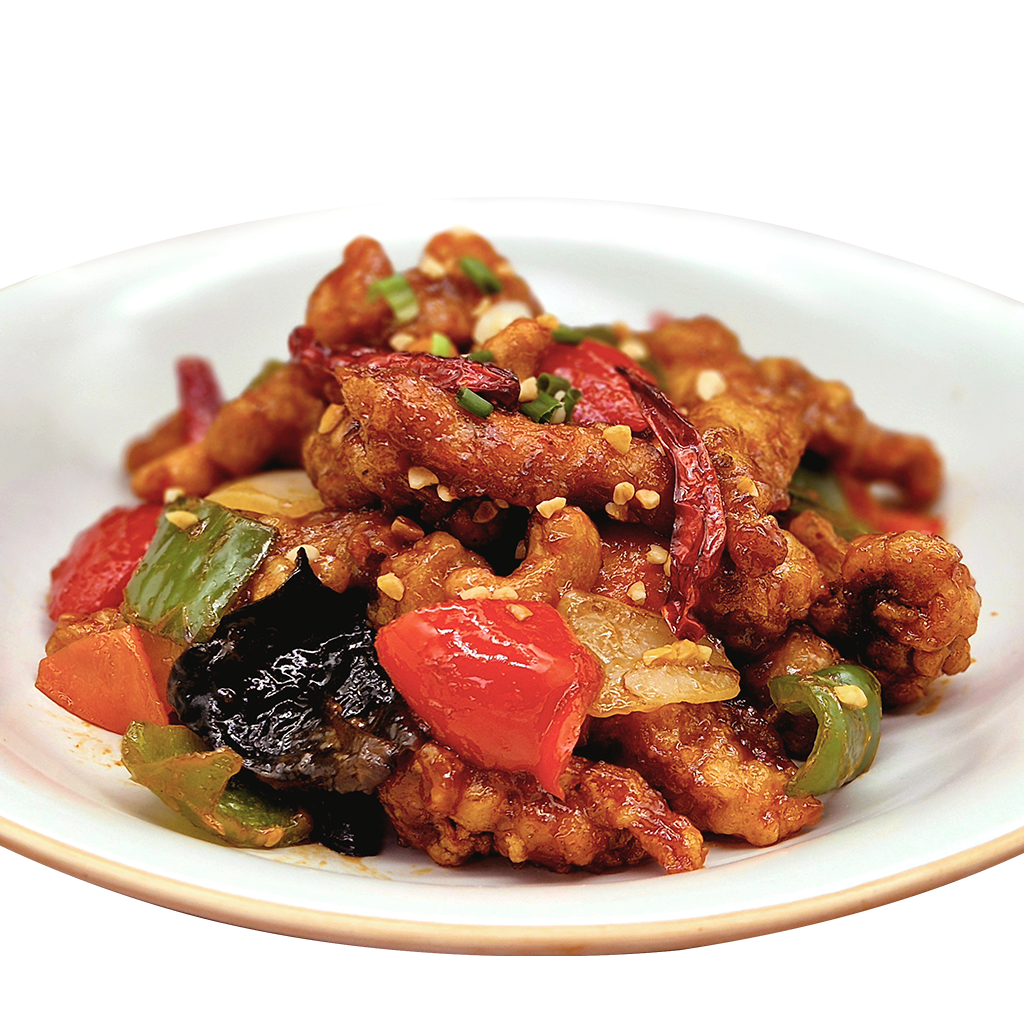 바삭하게 튀긴 닭다리살에 다양한 야채와 고소한 캐슈넛을 함께 볶아낸 요리
