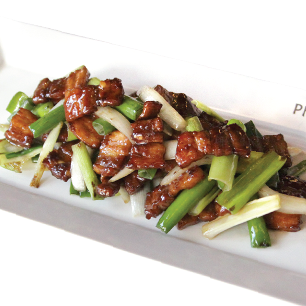 바삭하게 튀긴 삼겹살과 대파, 양파를 포메인 특제 피쉬 소스로 볶아낸 요리