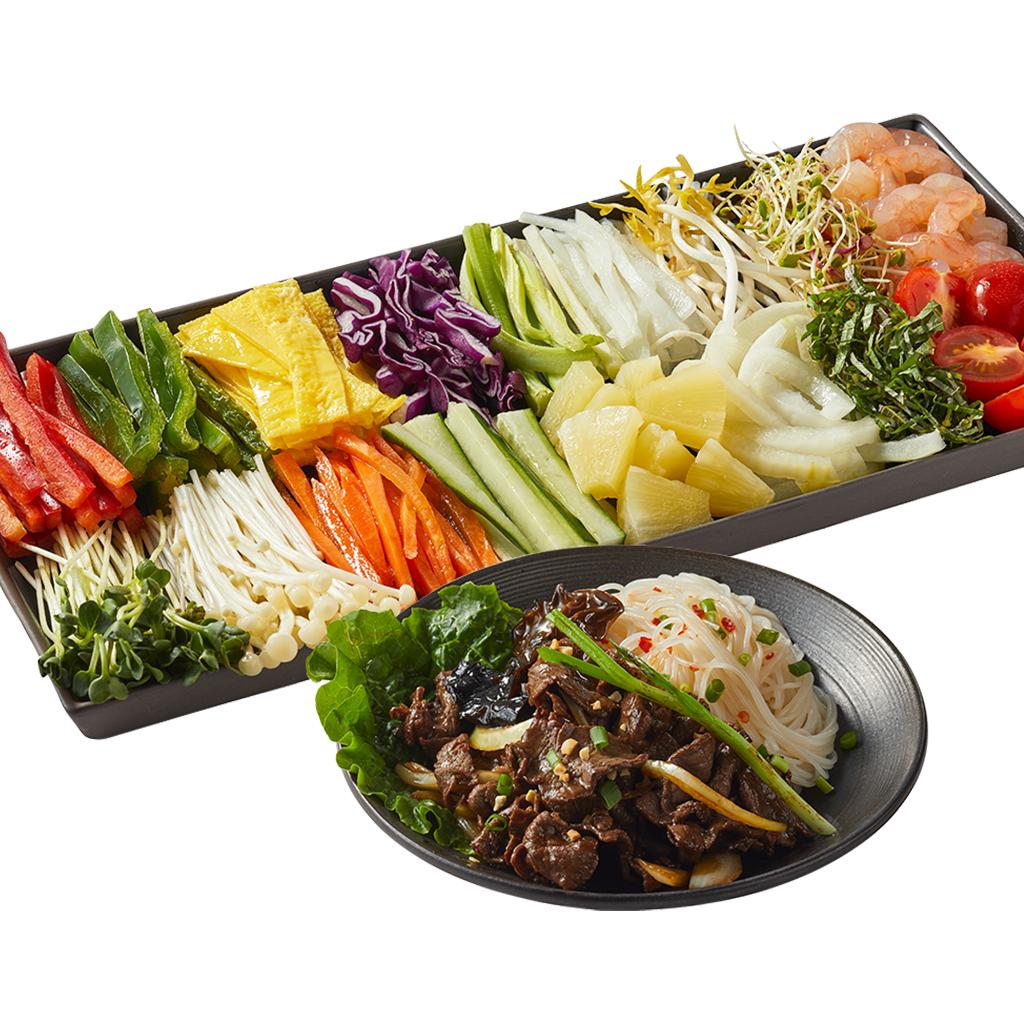 부드러운 소고기와 파인애플을 양파와 함께 볶아낸 뒤, 신선한 야채와 쌀국수에 곁 들여 피쉬 소스로 비벼 먹는 건강 메뉴