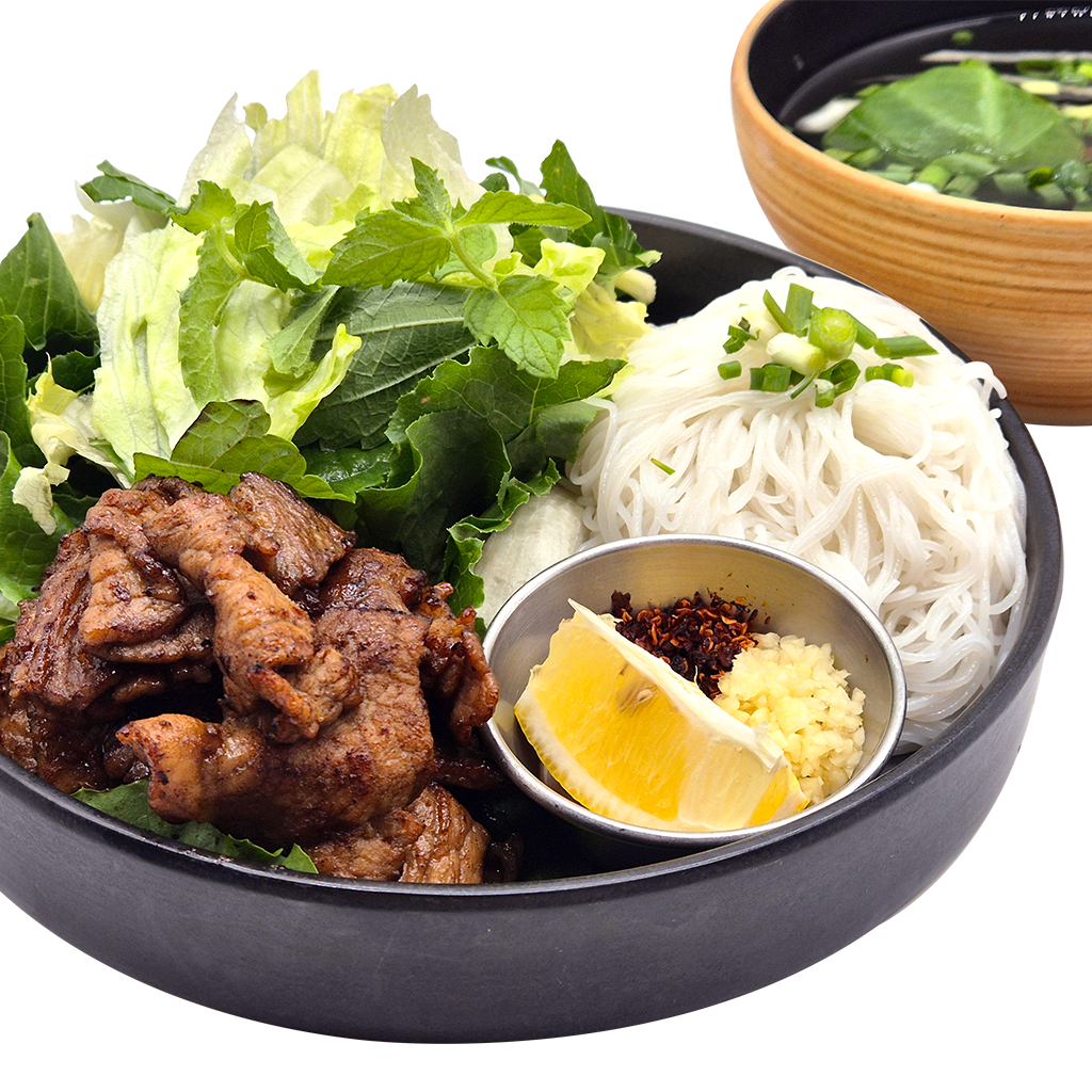 직화 돼지고기와 신선한 야채를 특제 느억맘 소스에 적셔 먹는 별미 쌀국수