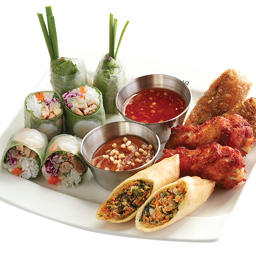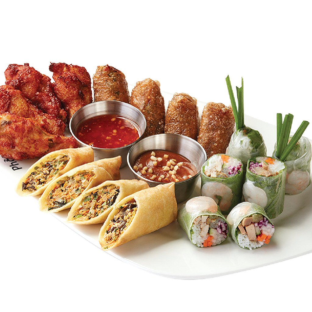 스프링롤, 짜조, 에그롤, 치킨윙을 함께 즐길 수 있는 애피타이저 세트