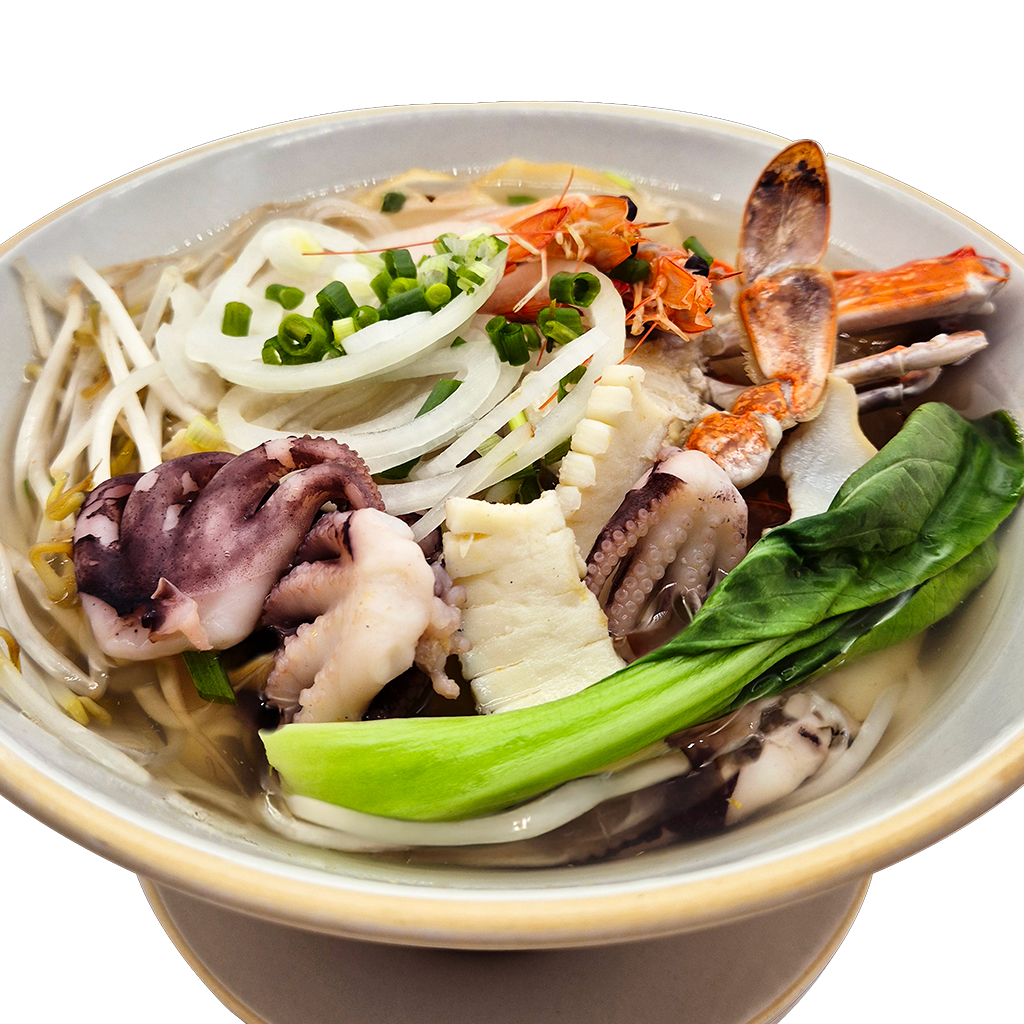꽃게, 새우, 소라, 오징어, 주꾸미 등 다양한 해산물을 넣은 깔끔한 쌀국수